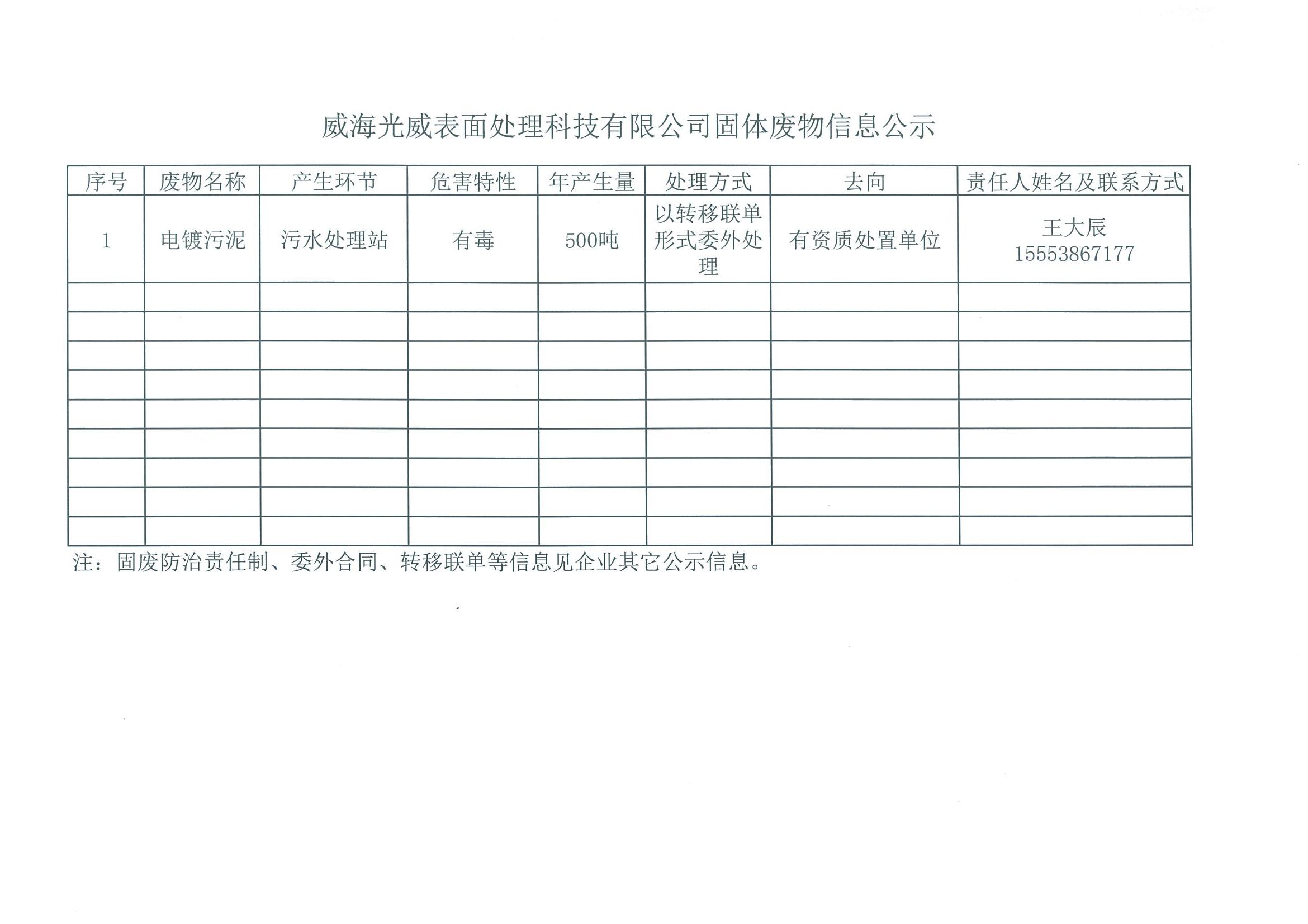 公示 | 威海光威表面處理科技有限公司固體廢物信息公示